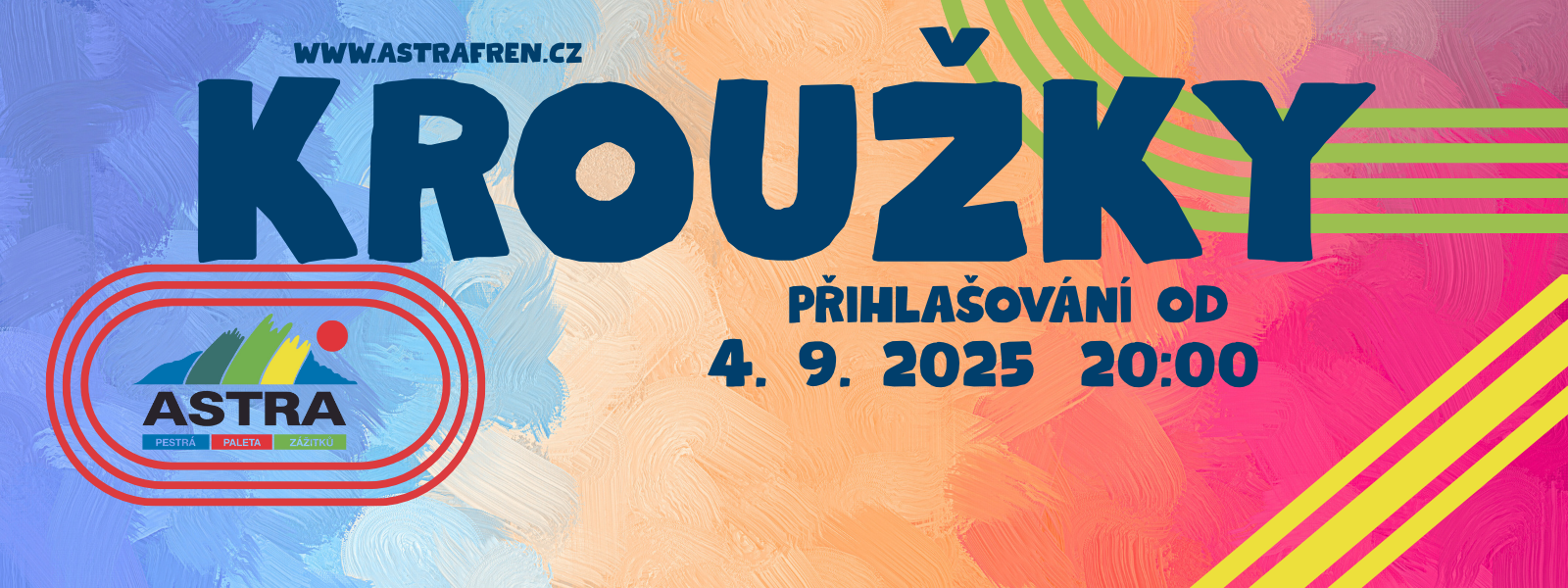 ... takový jednodenní tábor Zveme všechny na přespávačku, která je v režii oddílu Klubáci. Děti čekají různé hry, soutěže, zábava, dobrodružství a parta kamarádů. Pro táborové mazáky je to další možnost, jak strávit čas naplněný táborovým životem a dobrodružstvím. Pro táborové nováčky je přespávačka skvělá příležitost si vše vyzkoušet a taky si zkusit 1 noc mimo domov. Už teď je jedna věc jistá: nuda tady nebude mít své místo. Akce je určená pro Klubáky i širokou veřejnost. Začátek: sobota 22. 11. 2025 ve 14:00 v ubytovně Astry, 1. patro (nechoďte prosím dříve z důvodu příprav) Konec: neděle 23. 11. 2025 ve 14:00 tamtéž Z důvodu charakteru programu není možné nastoupit na akci později nebo odejít dříve. Díky za pochopení :) Elektronické přihlašování se otevírá ve čtvrtek 23. 10. 2025 ve 20:00 Přihlašovat a odhlašovat se je možné do neděle 16. 11. 2025 (včetně). Do tohoto data je třeba také zaplatit. Přihlášením souhlasíte se storno podmínkami, které jsou dostupné na webu Astry, CVČ. Cena akce: 600 Kč - v ceně je zahrnuto vše (ubytování na posteli nebo na matraci, kompletní strava, pitný režim i programové zajištění) Věk: 6 - 9 let Hlavní vedoucí: Veronika Lipková (verca.hq@seznam.cz, 724 296 981) - kontaktujte v případě programových a obecných dotazů Jan Hilšer - Jeník (hilser@astrafren.cz, 736 480 464) - kontaktujte ohledně přihlašování a plateb Seznam doporučených věcí pro přihlášené: Při balení vás prosím, aby byly všechny věci podepsané, ať si je děti poznají. Nabalte takové věci, u kterých nevadí, že se zašpiní nebo roztrhnou. Prosím, nabalte děti dle počasí. Pokud bude sníh, tak oteplováky, punčocháče, rukavice a čepici. Pokud bude hezky, tak spíše tepláky/zateplené kalhoty. Oblečení na ven dle počasí – 2 sady, oblečení dovnitř (tepláky, mikina…), přezůvky do budovy, pevné boty (opět dle počasí, pokud máte, tak určitě dvoje), tričko, spodní prádlo, ponožky, pláštěnka, spacák (stačí obyčejný, dekový – spíme uvnitř), (polštářek), pyžamo, hygienické potřeby (kartáček, pasta, hřeben, malý ručník…), kartičku zdravotní pojišťovny (stačí kopie – odevzdáváte při příchodu), všechny léky, které dítě užívá (podepsané) – také odevzdáváte (děti dle hygieny u sebe nesmí mít žádné) Dítěti prosím nedávejte žádné cennosti (mobily, šperky…), neručíme za ně a kazí táborovou atmosféru.