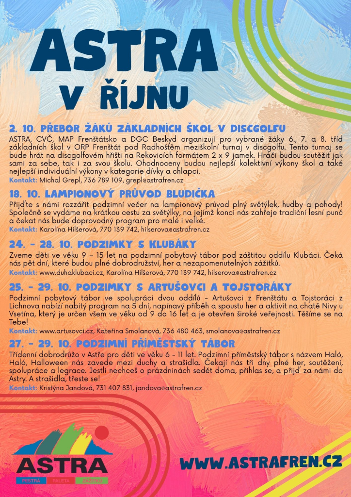 Že je podzim šedivý? Ale kdepak! My ho rozzáříme! Čeká nás sportovní klání v discgolfu, magický večer se světýlky na lampionovém průvodu a hlavně pořádná dávka zábavy o podzimních prázdninách. Pro malé i velké dobrodruhy máme připravené pobytové i příměstské tábory plné her a halloweenského veselí. Tak neváhejte a pojďte do toho s námi!