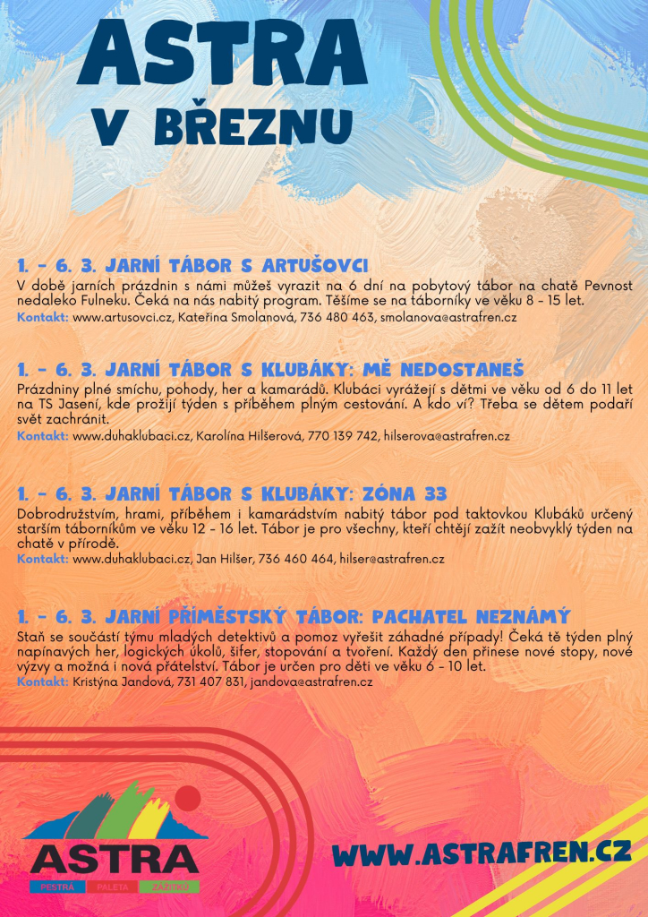 V březnu jdou školní povinnosti stranou, protože nás čeká týden volna! A v Astře rozhodně nebudeme sedět v koutě. Pro všechny, kteří nechtějí prázdniny prolenošit u televize, máme připravenou pořádnou nálož zážitků. Artušovci obsadí chatu Pevnost u Fulneku, zatímco Klubáci rozjíždějí dvě mise – mladší budou cestovat a zachraňovat svět na Jasení, ti starší prozkoumají tajemnou Zónu 33 na Semetíně.