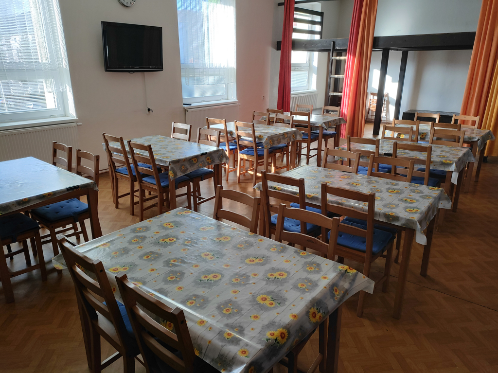 Jídelna disponuje 32 místy k sezení = 8 stolů po 4 židlích + skládací židle pro doplnění kapacity. K dispozici v této místnosti je také televize, knihovna a výdejní okýnko z kuchyně.